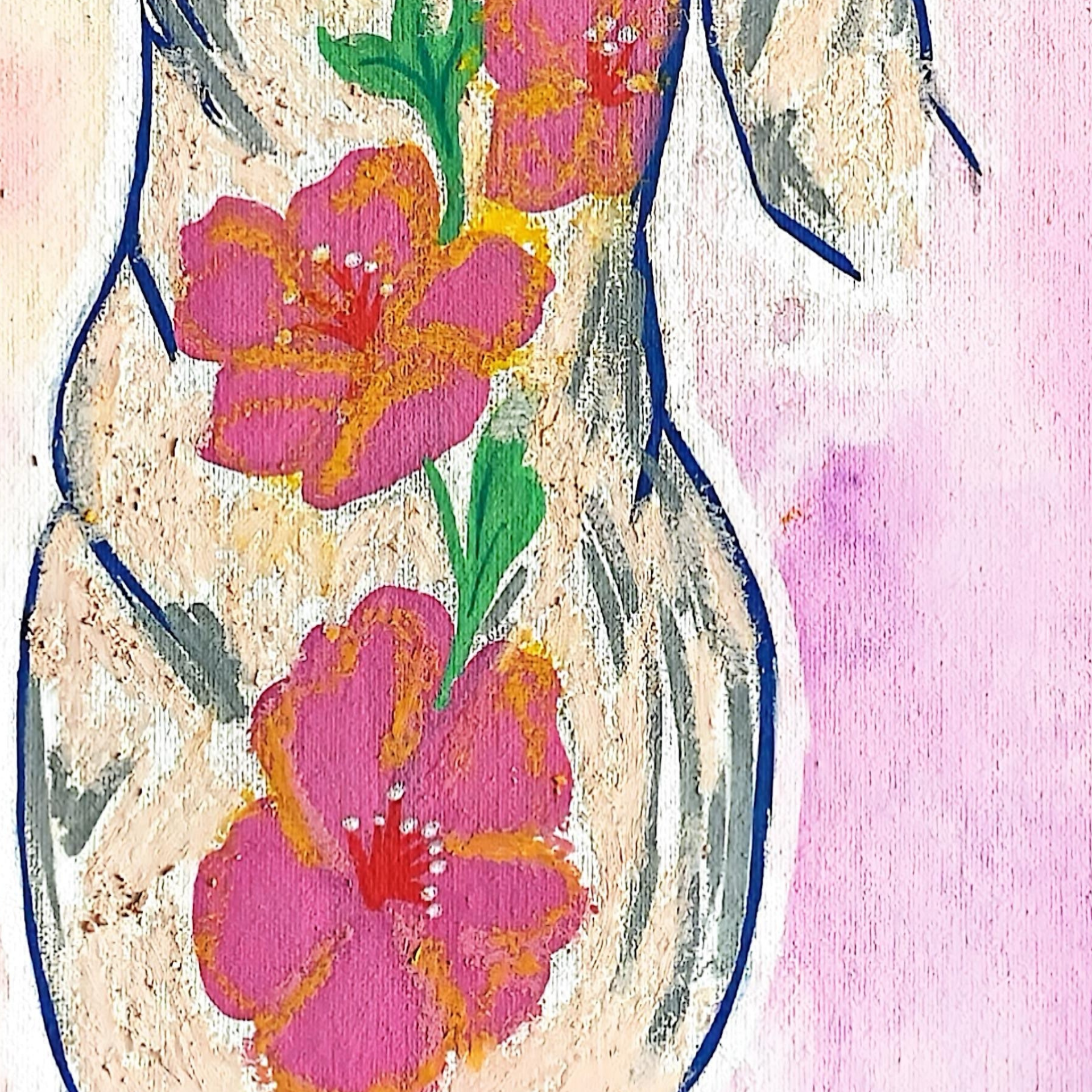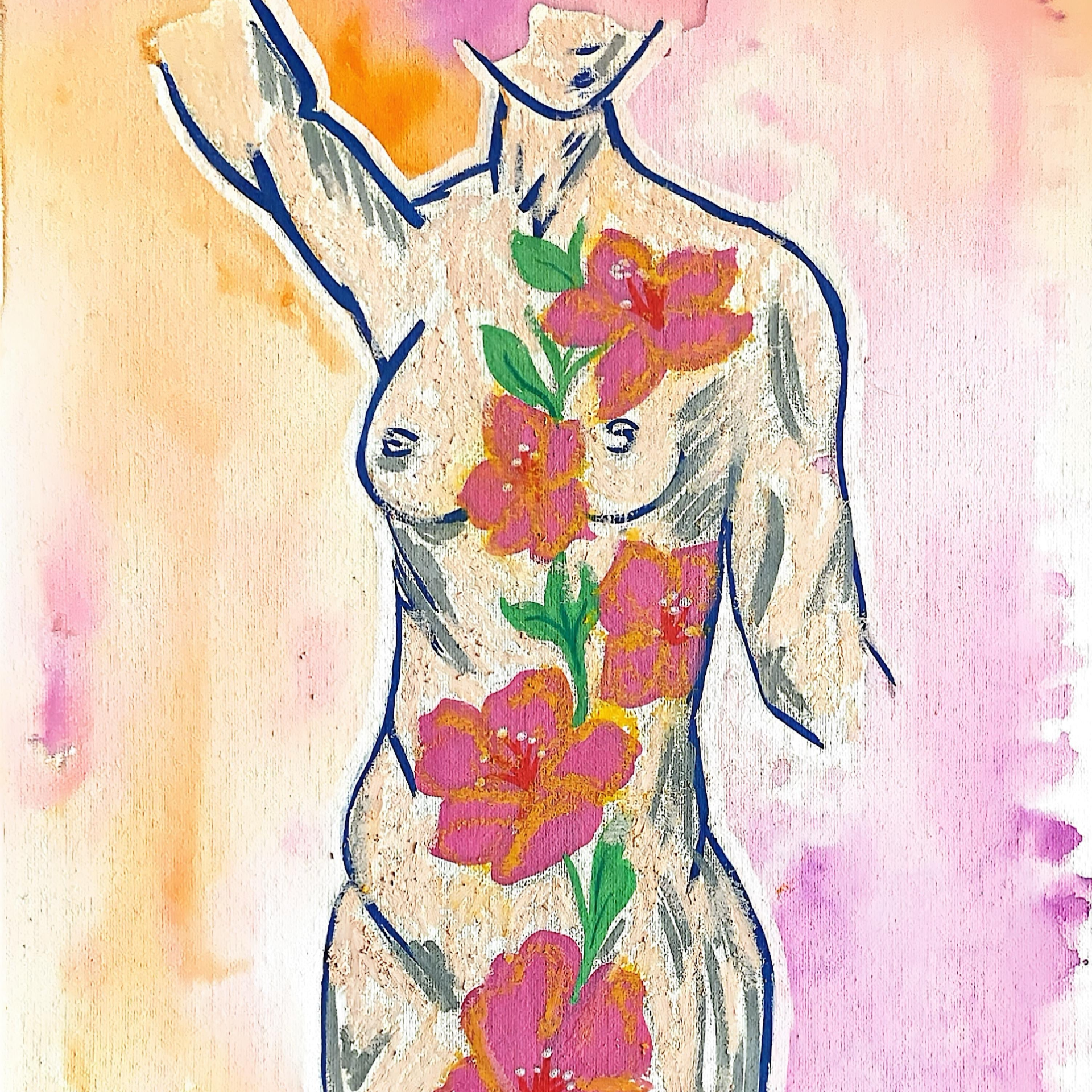 The flowers growing through the figure represent healing, self-acceptance, and the quiet power of transformation.